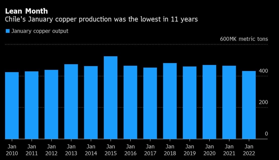 Největší světový producent mědi zaznamenal oproti lednu 2021 pokles produkce o 7,5 %, přičemž mezi důvody patří horší kvalita rudy i nedostatek vody. “Ve většině případů jsou však faktory brzdící těžbu pouze dočasné,” uvedl Diego Hernandez, bývalý generální ředitel společností Codelco a Antofagasta Plc, který nyní stojí v čele společnosti Sonami.
