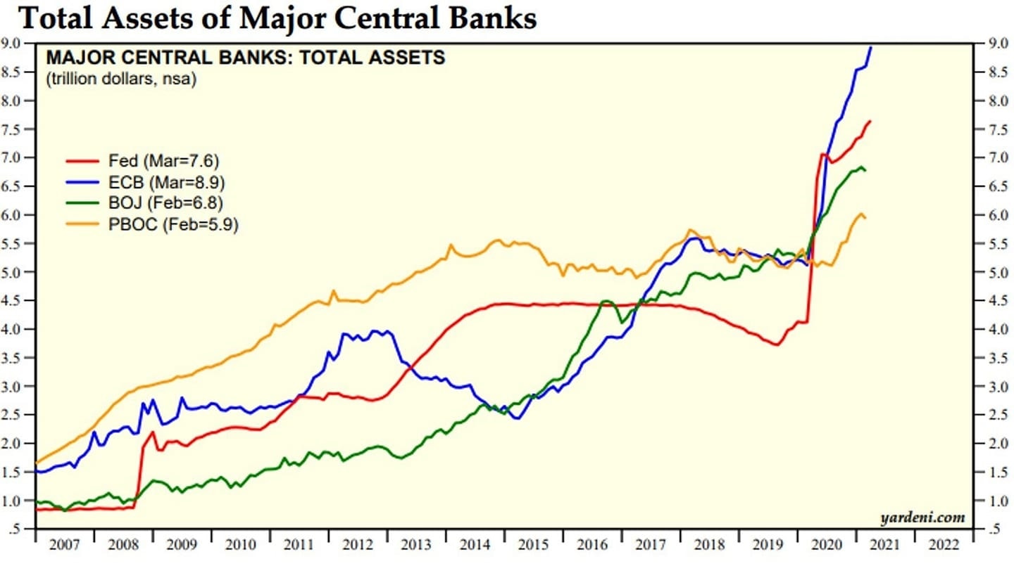 4 největší centrální banky ke Q1 2021 nakoupily aktiva o hodnotě více než 30 bilionů dolarů