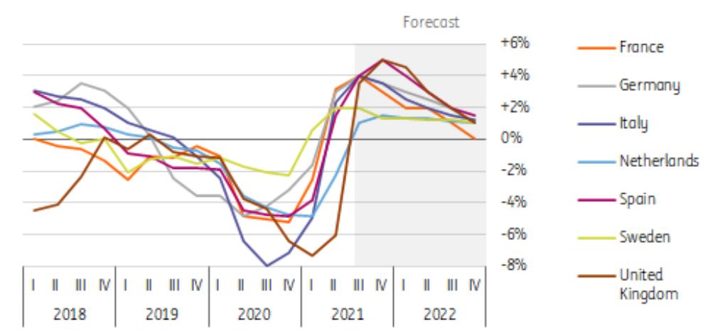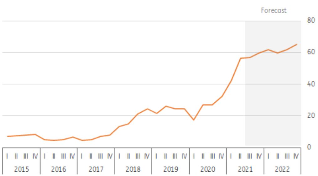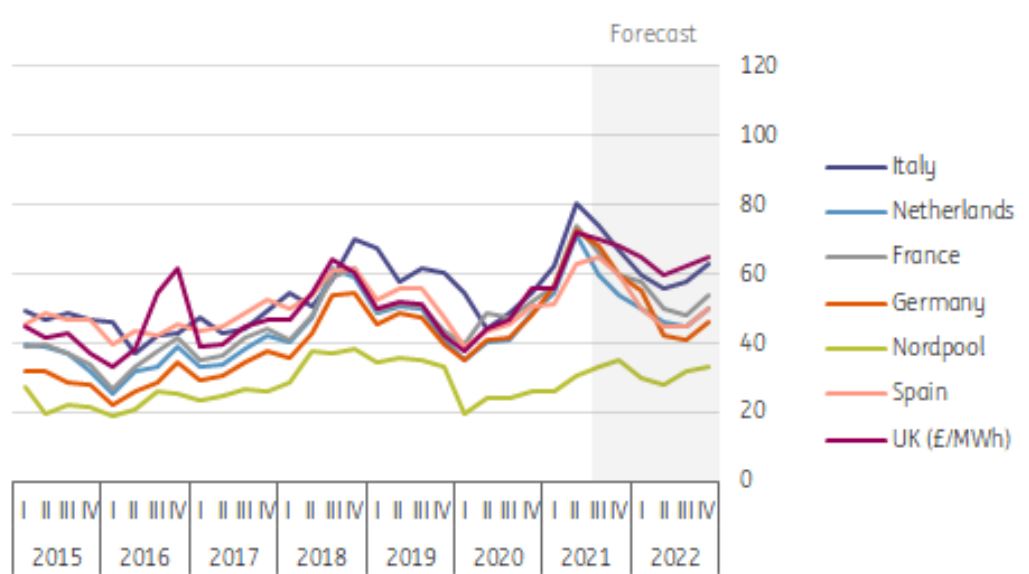 Ceny elektřiny po propadu vyvolaném krizí covid-19 výrazně vzrostly. Například ve Velké Británii se jednoletý forwardový kontrakt na elektřinu na konci 2. čtvrtletí obchodoval na úrovni 72,08 liber za MWh. To je cena, která nebyla zaznamenána od roku 2008. V důsledku toho se evropské energetické společnosti, zejména ty, které jsou z velké části vystaveny aktivitám obchodníků s elektřinou, budou v letech 2021 a 2022 těšit silnému oživení.