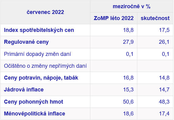 Česká národní banka ve své zprávě uvádí, že červencový meziroční růst spotřebitelských cen byl ve srovnání s letní prognózou o více než jeden procentní bod pomalejší. Na tuto uvedenou odchylku působily všechny složky inflace s výjimkou změn nepřímých daní. Nejvýrazněji se na odchylce podílely ceny potravin, v menší míře pak jádrová inflace, regulované ceny a ceny pohonných hmot.
