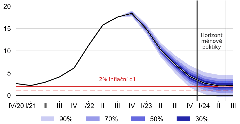 Inflační prognóza České národní banky byla aktualizovaná. Ještě předešlá počítala s tím, že se tuzemská inflace dostane na úroveň 20 %.