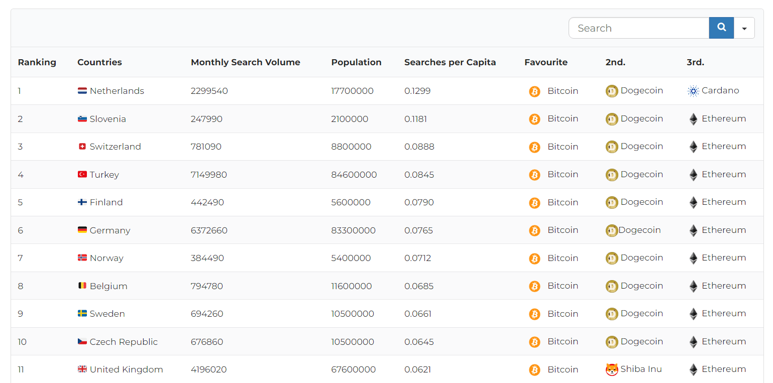 Kryptoměny jsou nejvyhledávanější v Nizozemsku, které je první. Na druhý stupínek se následně dostalo Slovinsko a třetí příčku zaujalo Švýcarsko. Slovinsko je lehkou anomálií. Malý stát z jihu Evropy rozhodně nepatří mezi ekonomické velikány, nicméně v kryptoměnách si své místo očividně najde.