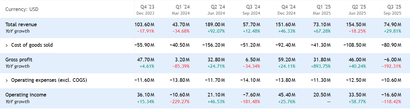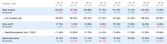 Ve Q3 2025 společnost dosáhla celkových tržeb ve výši 74,9 milionu dolarů, což představuje přibližně 30% meziroční nárůst oproti stejnému období roku 2024.