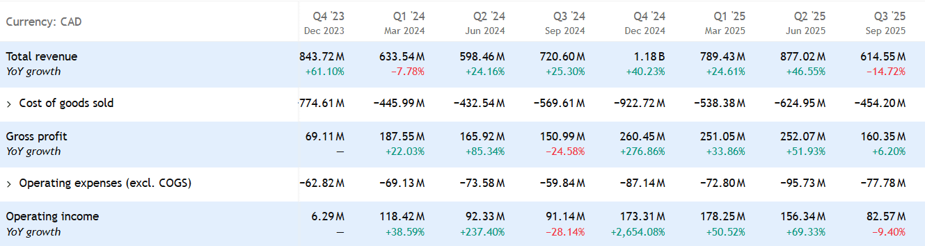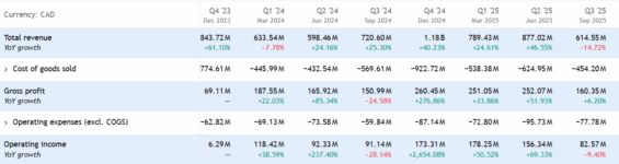 Tržby klesly na614,5 milionů CAD, tedy přibližně o 15 % meziročně, především kvůli nižším prodejním objemům uranu. Společnost ale dokázala udržet zdravé marže díky vyšším realizovaným cenám, které zčásti kompenzovaly slabší objemy.