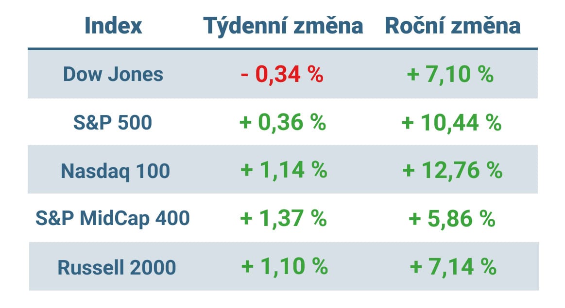 Tabulka ukazuje vývoj nejvýznamnějších amerických indexů v tomto týdnu a v roce 2025