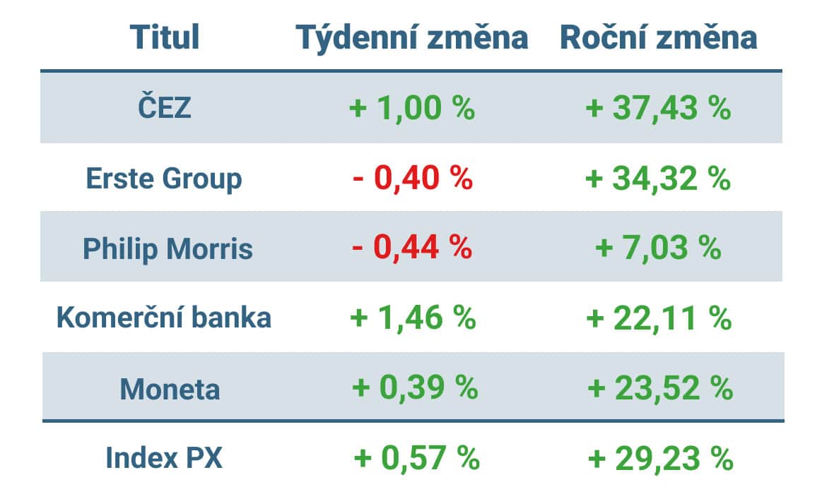Vývoj ceny nejvýznamnějších titulů obchodovaných na pražské burze v tomto týdnu a v roce 2025