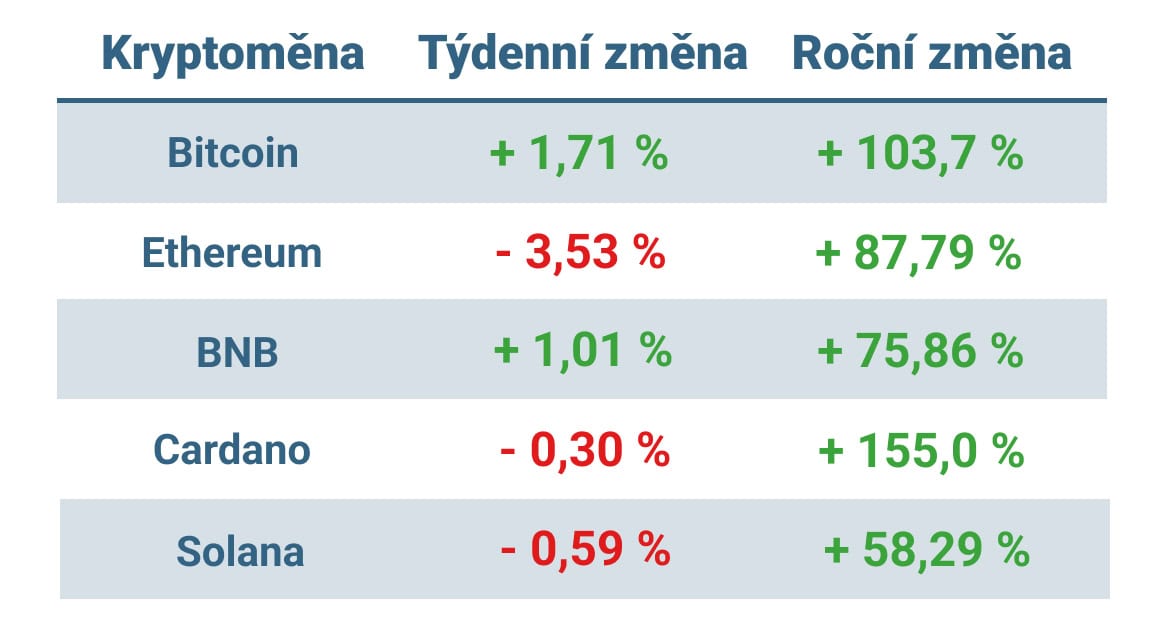 Další významné altcoiny zůstaly v týdenním srovnání téměř beze změny – BNB získalo 1 % a ztráty do 1 % zaznamenaly Cardano a Solana.