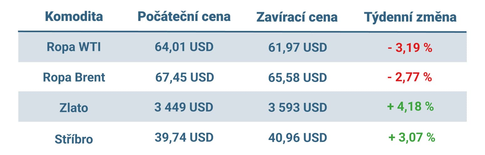 Naopak doslova zářily drahé kovy. Cena fyzického zlata v uplynulém týdnu vyletěla na nové rekordní maximum, když si zářivý kov polepšil o více než 4 % a ke konci pátečního obchodování se usadil na hodnotě 3 593 dolarů za unci.