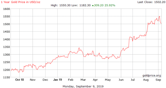 To vše tlačí nahoru ceny zlata, které v minulých týdnech překonávaly své dosavadní několikaletá maxima. Nejvyšší mety přitom dosáhlo 4. září, když se dostalo nad 1550 dolarů za trojskou unci. Nyní probíhá menší korekce, i přesto však zaznívají optimistické hlasy věštící další růst.