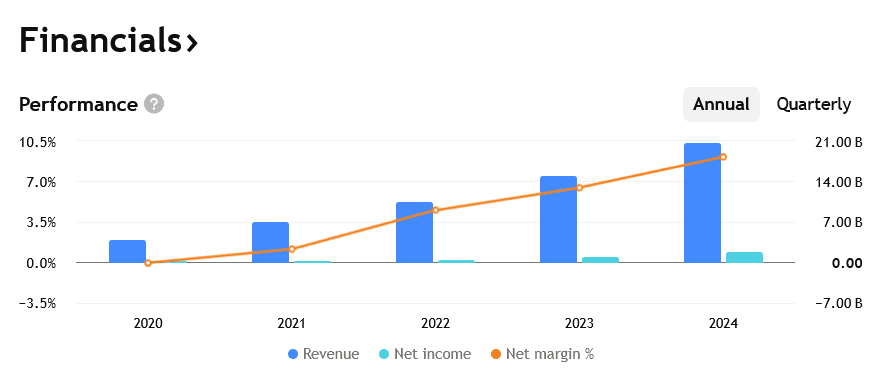 Tržby, zisky a marže MercadoLibre za několik posledních let (do roku 2024).