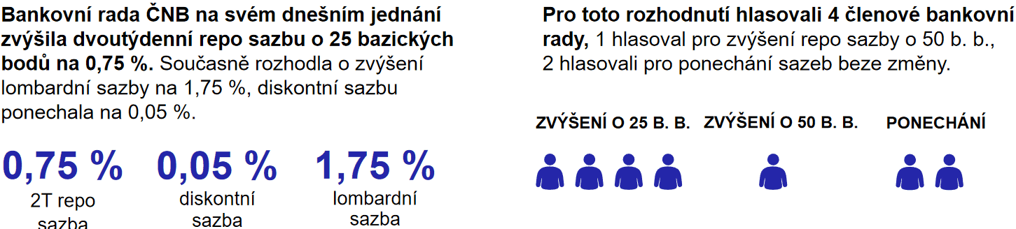 Jak jsem zmínil v úvodu, došlo již k druhému navýšení základní úrokové sazby v tomto roce a je celkem jisté, že další navyšování bude následovat. Rada centrální banky je ovšem opatrná a sazby byly zvýšeny pouze o 0,25 p.b., což je v jejich terminologii 25 bazických bodů. Pro navýšení hlasovalo rovnou pět členů rady, zatímco dva hlasovali pro ponechání.