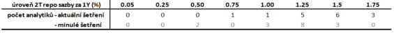 Ještě si dovolím okomentovat následující tabulku. Česká národní banka ve spolupráci s analytiky z komerčního sektoru zpracovala dokument ohledně prognóz o krátkodobém vývoji úrokových sazeb. Z projekce analytiků vyplývá, že do konce roku by mělo dojít ještě k jednomu navýšení.