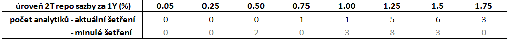 Na základě tabulky je zřejmé, že drtivá většina analytiků kalkuluje s tím, že sazba bude minimálně na 1 %. Největší počet z nich počítá s 1,5 %, tři z nich dokonce s 1,75 %. V těchto chvílích je tudíž takřka jisté, že navyšování bude i nadále postupně pokračovat. Minimálně do doby, než se inflace nevrátí do normálu.