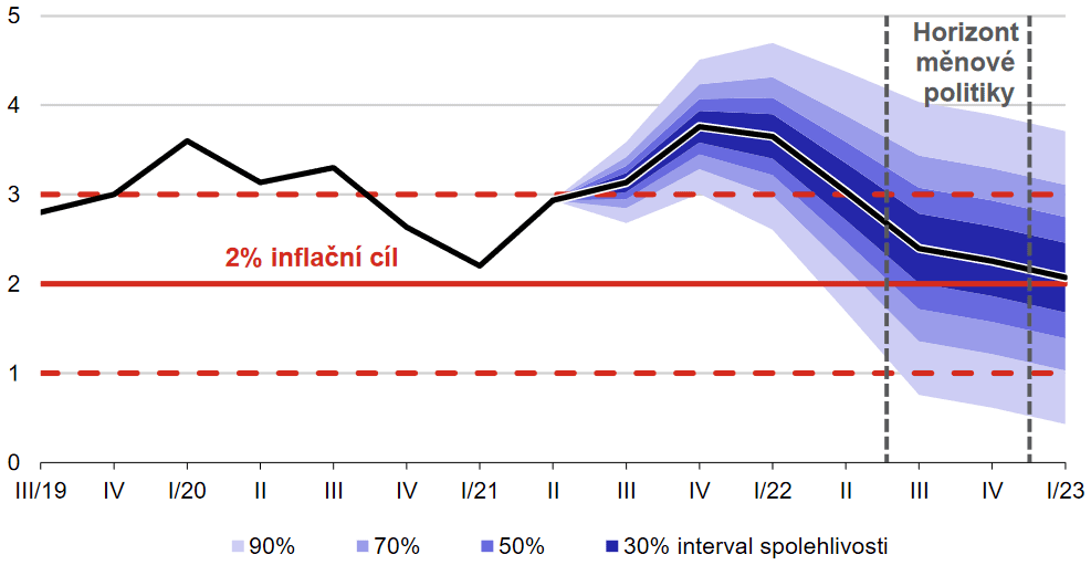 Česká národní banka učinila tento krok, protože dle jejich prognóz kalkulují s tím, že inflace v následujících čtvrtletích výrazně překoná inflační cíl, který je nastaven na 2 %. Rozptyl prognózy je na následující kvartály přibližně 3 – 4,8 %. Jedná se tedy o dost široké rozmezí, ale z projekce je zcela zřejmé, že inflační cíl bude po nějakou dobu překonán.