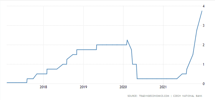 Poslední zvýšení sazeb znamená, že jsme se vrátili do roku 2008. Tehdy byly úrokové sazby na nynějších 3,75 %. Vyšší byly už jenom na počátku milénia, cca 5 %. A právě k těm 5 % jednoznačně směřujeme. Ono se i víceméně očekávalo, že minimálně kolem 4 % se budeme pohybovat. S tím počítá i prognóza ČNB, dle které by měl být dosažen vrchol v průběhu prvního čtvrtletí roku 2022.