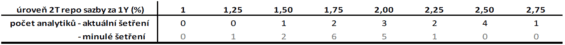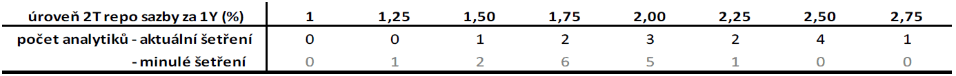 Ještě v srpnu ani jeden analytik neočekával, že by mohla 2T repo sazba jít až na 2,5 %. Nyní mají takový odhad až čtyři z nich. Jeden dokonce kalkuluje s 2,75 %. Celkově je tak z tabulky znát výrazný posun, kdy větší část respondentů kalkuluje s 2T repo sazbou minimálně 2 % a výše.