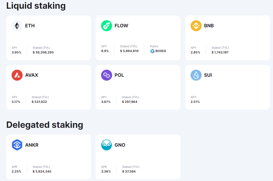 Pod tímto termínem je možné představit si veškerý staking na centralizovaných burzách (Binance či Coinbase) a v kryptoměnových peněženkách (Trust Wallet či Coinomi), nebo na různých decentralizovaných protokolech (např. Ankr či Lido).