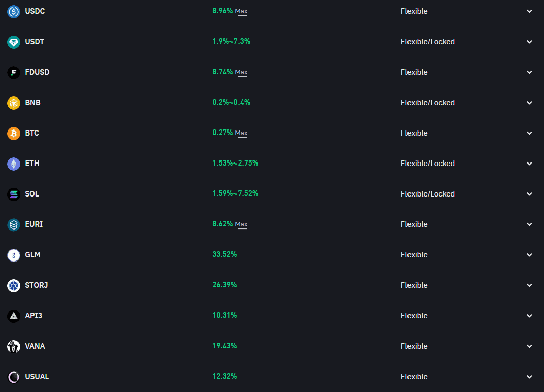 Na následujícím obrázku je příklad dostupných kryptoměn pro staking na Binance.