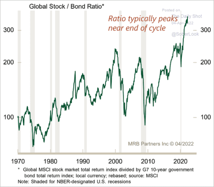 Výkonnost akciového trhu výrazně předčila dluhopisový trh. Graf vizualizuje poměr mezi výnosy akciového trhu a 10letých federálních dluhopisů. Od začátku roku 2020 se ty nůžky rozšířily o více jak 70 %. A nadvýkonnost akciového trhu nad dluhopisovým trhem znamená jedno. Hospodářský cyklus vrcholí, recese se blíží.