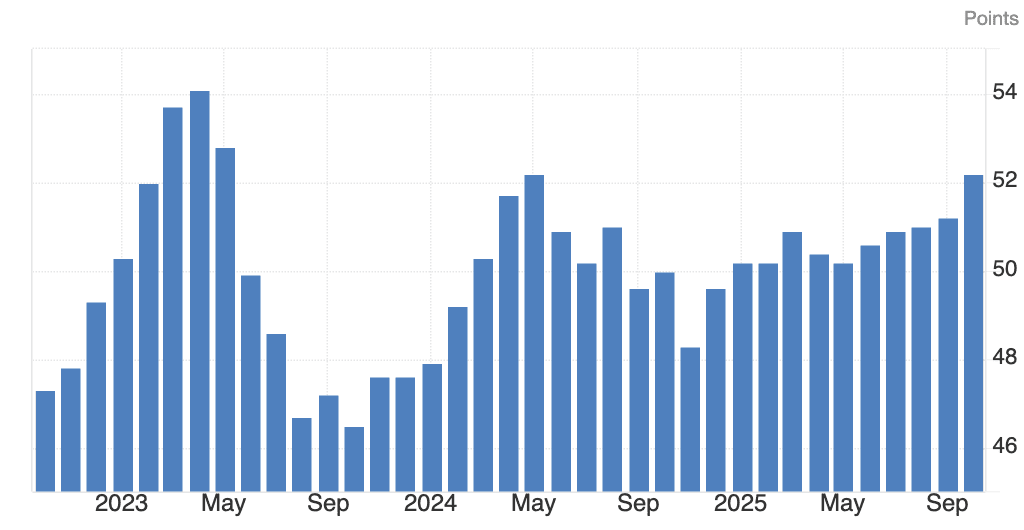 Společnost S&P Global uvedla, že její kompozitní index PMI dosáhl hodnoty 52,2 bodu, což je nárůst z 51,2 bodu v září a překonání konsensuálních odhadů kolem 51,1 bodu.