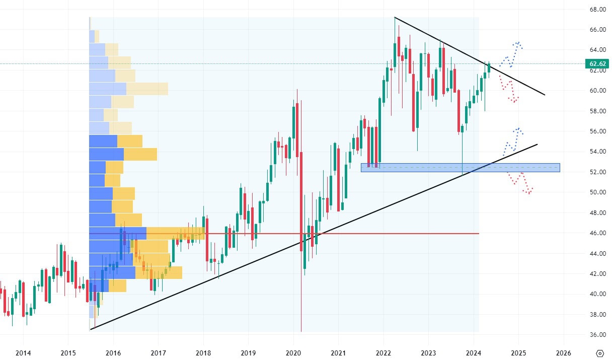 Pokud by došlo k proražení její hodnoty, dostanou se i z krátkodobějšího pohledu akcie do růstového trendu s možností atakovat své ATH. Pokud dojde opět k odrazu směrem dolů, trh již otestoval nejbližší support na ceně 52 USD, což může způsobit výraznější cenový pokles.