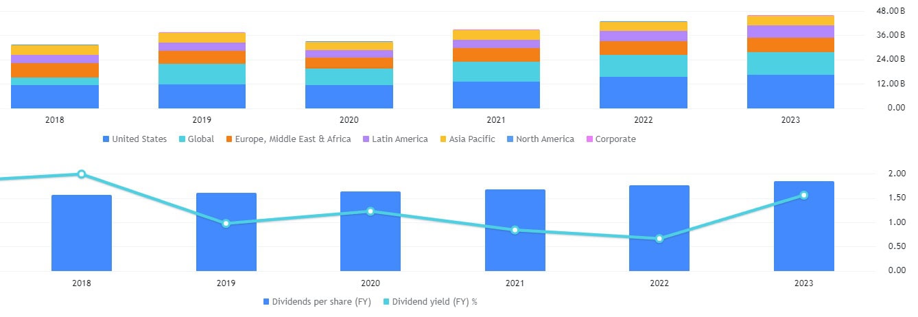 Na grafu níže si také můžeme povšimnout, že tržby rostou kontinuálně v čase ve všech světových regionech. Naopak dividendy jsou v čase stabilní a společnost nabízí investorům dividendový výnos 3,11 %, což značí kvartální výplatu dividend v hodnotě 0,49 USD za akcii.