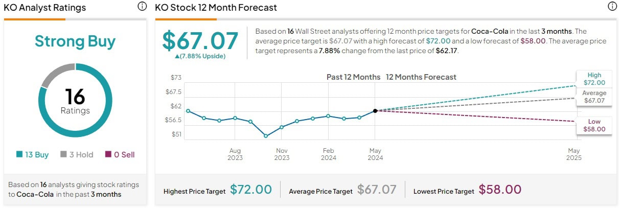 Stanovení cenové predikce pro akcie Coca-Cola se zúčastnilo 16 analytiků z Wall Street. Celkem 13 z nich očekává agresivní cenový růst s cílovou hodnotou 72 USD za akcii.