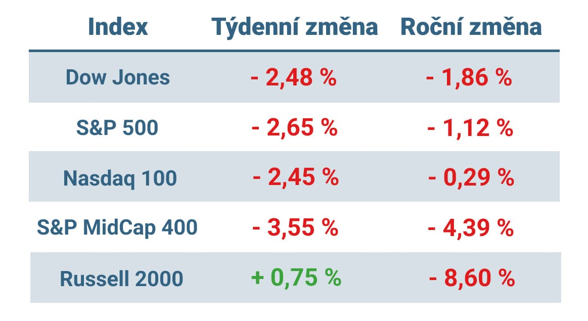 Tabulka ukazuje vývoj nejvýznamnějších amerických indexů v tomto týdnu a v roce 2025