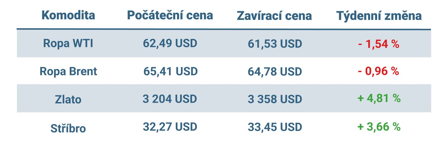 Výrazný růst jsme naopak viděli u drahých kovů. Cena fyzického zlata v uplynulém týdnu vyletěla téměř o 5 % a ke konci pátečního obchodování se usadila na hodnotě 3 358 dolarů za unci.