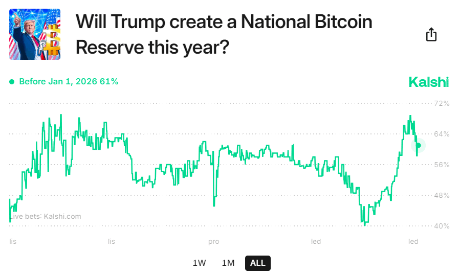 Právě šance na to, že Trump udělá z Bitcoinu strategickou rezervu již tento rok dle predikčního trhu Kalshi rapidně vzrostly. Zatímco 10. ledna činily 41 %, 18. ledna vystoupaly až na téměř 69 %.