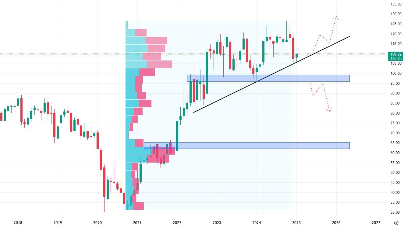 Dokud se jejich hodnota nad ní udrží, mají investoři vyhráno. Pokud by ovšem došlo k jejímu průraz, nejbližší support se nachází až na ceně 100 USD za akcii.