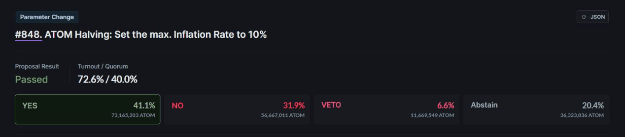 Proposal s pořadovým číslem #848 snižuje meziroční inflaci mince ATOM z nynějších cca 14 % na pevně daných 10 %. Aby toho šlo dosáhnout, musí dojít i ke snížení odměn pro validátory, kteří získávají ATOM za ověřování transakcí a zabezpečování sítě. Ti si pohorší z ročního úroku cca 19 % na 13,4 %.