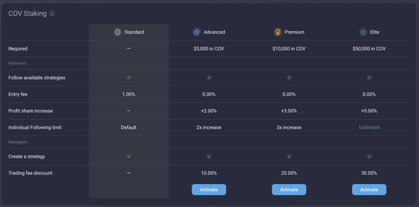 COV token je nativní měna balíčku produktů od Covestingu, do kterých patří i copy trading modul. Cíl vývoje bylo využití v copy trading modulu, ve němž odemyká nové uživatelské úrovně pro sledující a strategy managery.