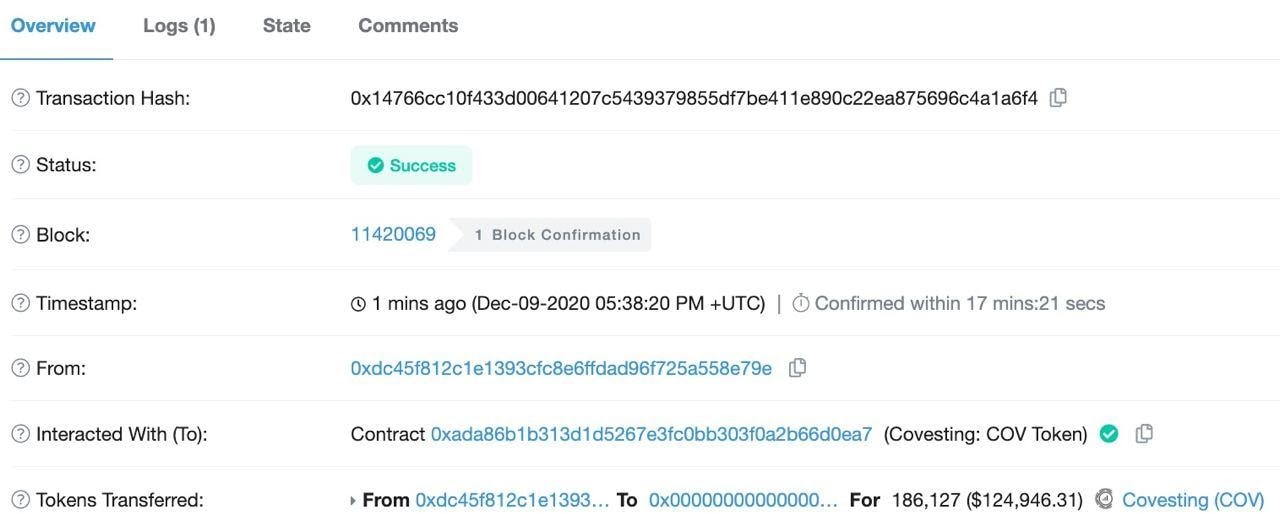 Covesting komunitu šokoval tím, že při prvním pálením spálili celkem 186 127 COV, což v danou chvíli znamenalo zhruba ekvivalent 124 946 dolarů.
