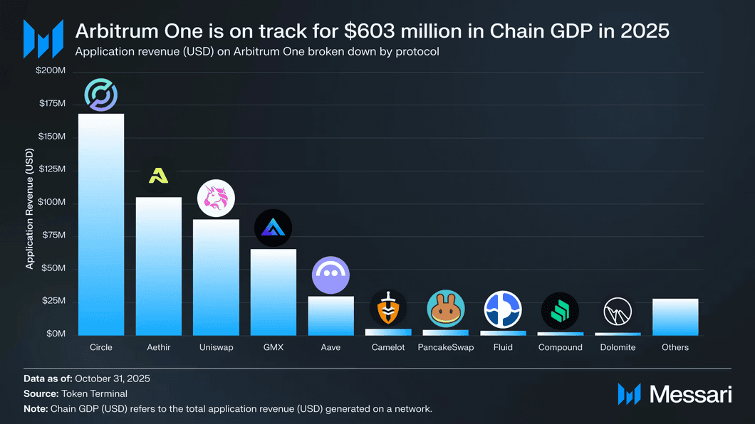Aplikace na Arbitrum One seřazené podle tržeb za 2025.