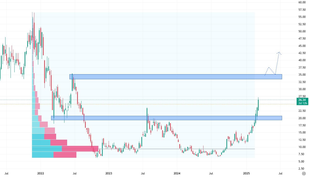 Na vyšších cenových úrovních totiž není příliš velké množství rezistencí a jejich hodnota by mohla růst až do cenového výběžku na 28 USD za akcii.