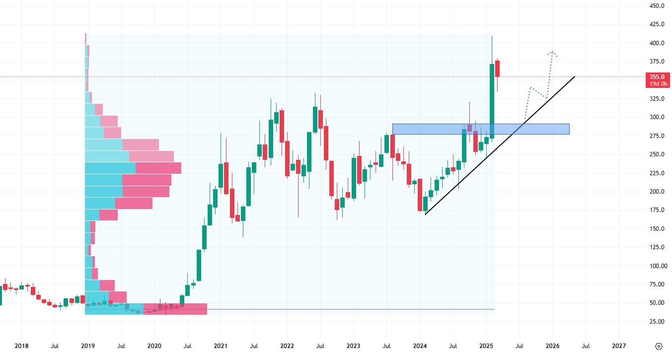 Velmi agresivní průraz z cenových maxim z roku 2023 nyní vytvořil support, takže akcie mohou ještě provést pullback před tím, než budou pokračovat na vyšší cenové úrovně.