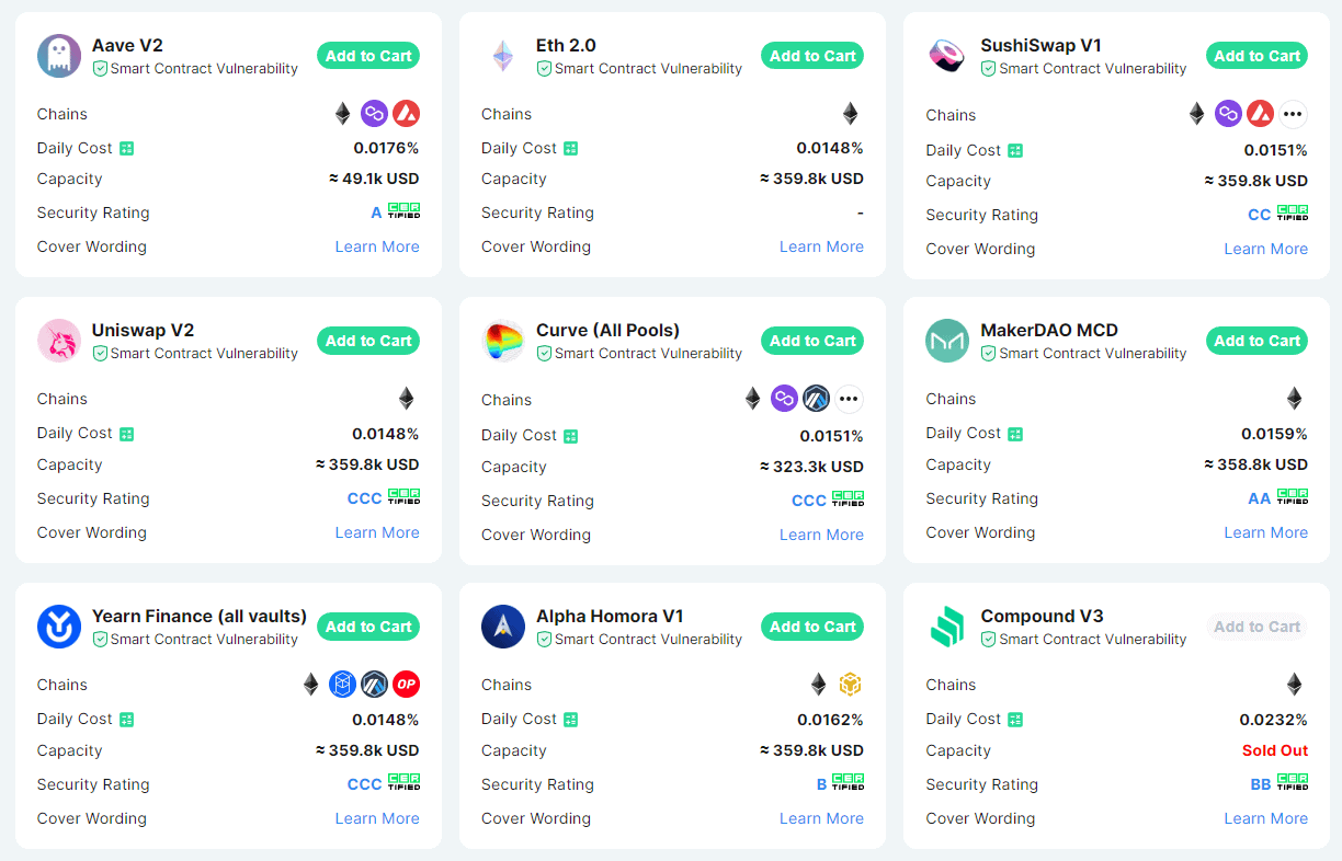 Cena jednotlivých produktů závisí na různých faktorech – na míře nastakovaných prostředků (rezerva na vyplácení odškodného) a na důvěryhodnosti DeFi protokolu či centralizované burzy, na níž se pojištění vztahuje.