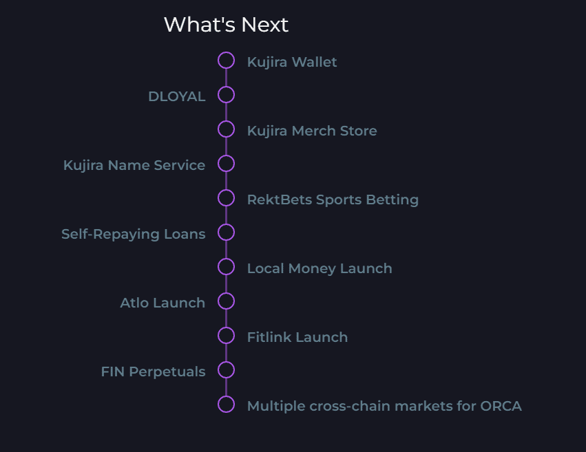 V roadmapě má Kujira již spoustu splněných cílů. V roce 2023 plánuje ještě více rozvíjet burzu FIN, chce na ni přidat maržovní obchodování a perpetuální kontrakty. Dále chce spustit řadu dalších aplikací, mezi nimiž je např. nativní peněženka Sonar Wallet, platforma na sázení, vlastní merch či např. rozšíření tržiště ORCA na další chainy.