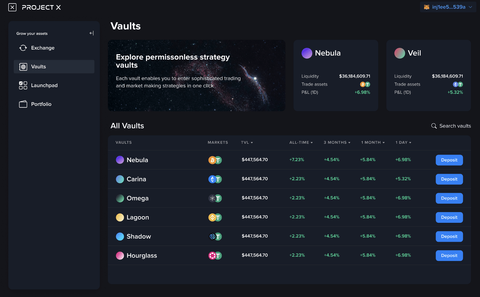 Do vaultů si uživatelé mohou uzamknout své vlastní kryptoměny, např. USDT, a generovat zisk skrze automatizované strategie unikátní pro každý vault. Např. vault Nebula, jehož ukázku naleznete na videu níže, umožňuje vložené kryptoměny použít pro market making na trhu Helixu, přesněji na obchody s Bitcoinem.