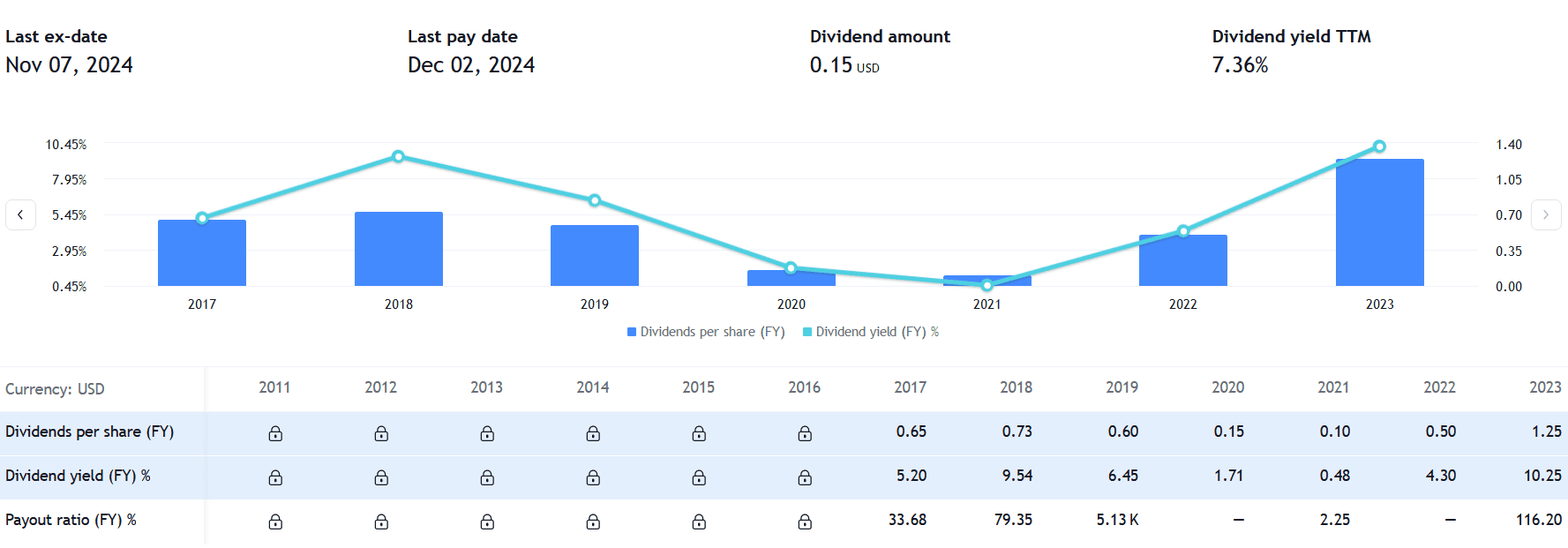 Dividendy jsou opravdu tučné. Až na covidové roky 2020 a 2021 firma nabídla velmi zajímavý dividendový výnos. V roce 2023 to bylo dokonce přes 10 %.