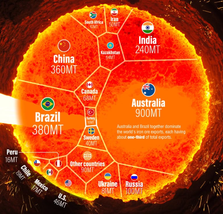 Grafika těžby železné rudy po jednotlivých státech