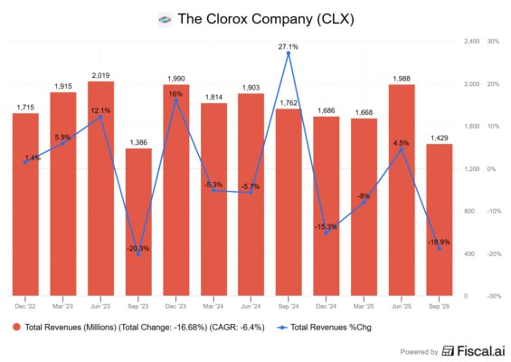 V roce 2025 index S&P 500 vzrostl o 17,9 %, zatímco základní spotřební výrobky zaostávaly a poklesly o 1,2 %. Clorox ale čelil tvrdší realitě, když hodnota jeho akcií poklesla o 37,9 %.