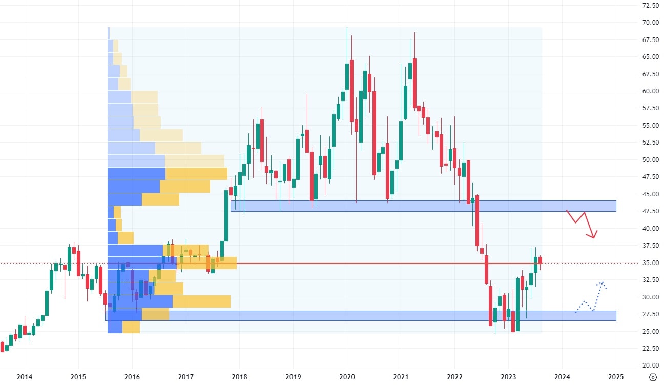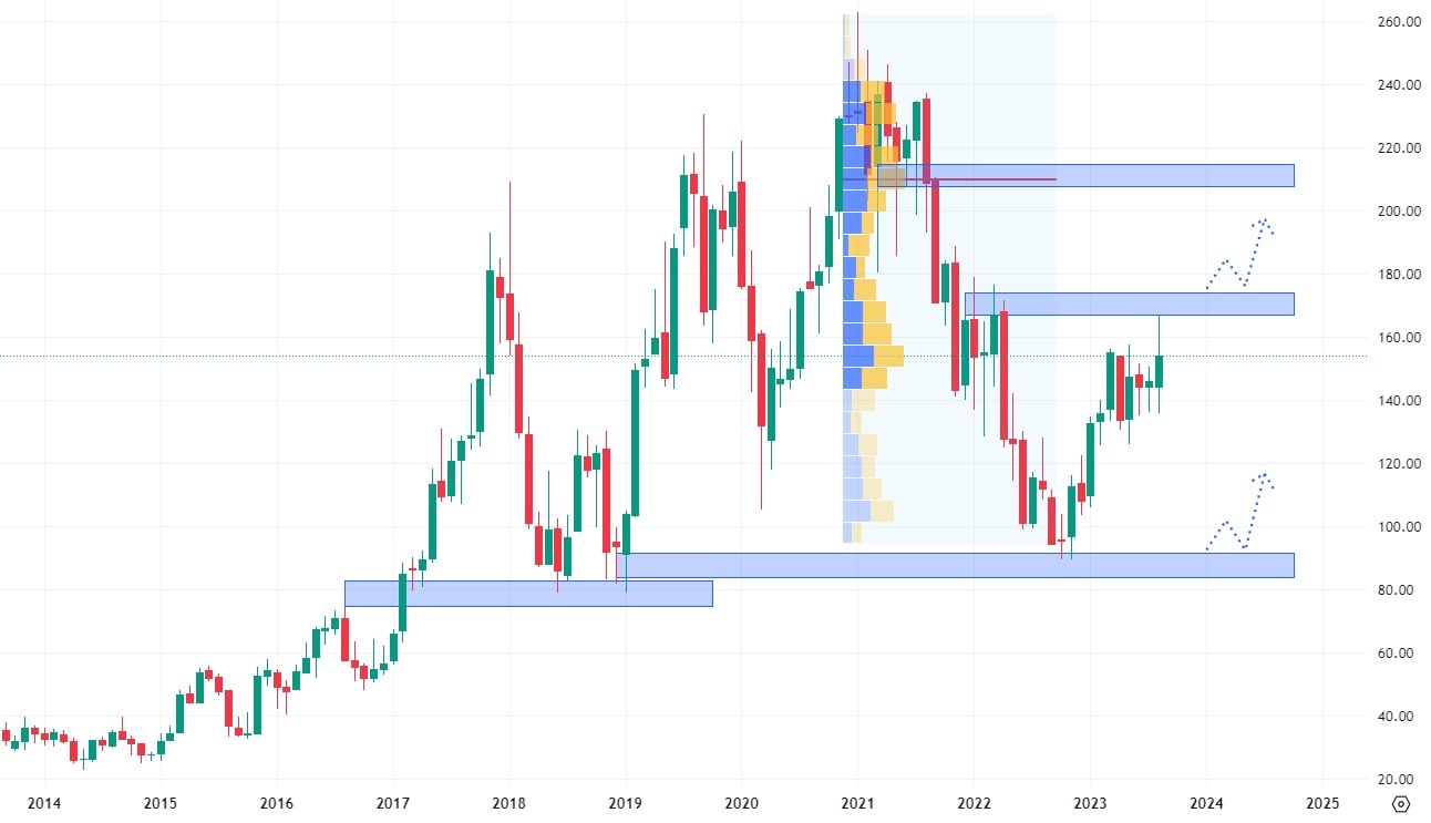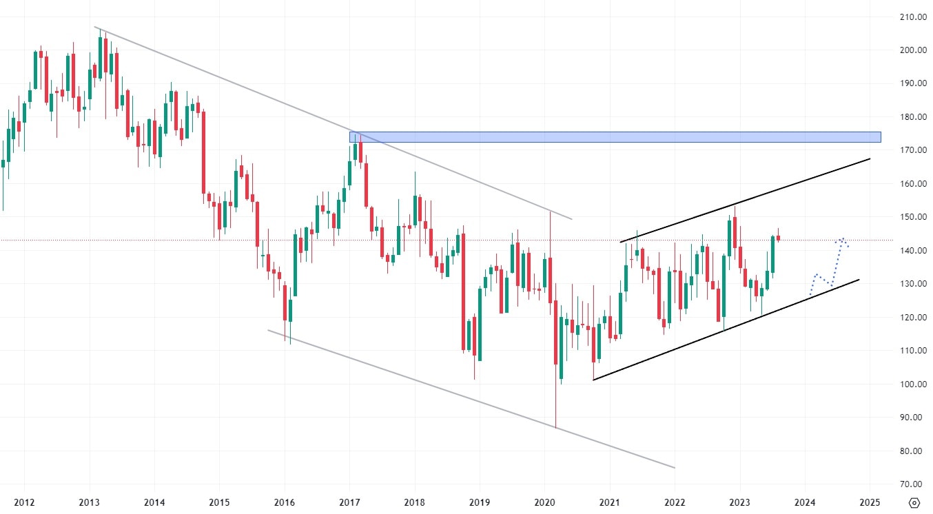 Akcie IBM již tak konzervativní nejsou. Na měsíční bázi se obchodují ve vysoké volatilitě, která za posledních 10 let vykázala dva hlavní trendy. Klesající trend akcií byl ukončen v roce 2021, kdy započal nový růstový trend. Akcie se v rostoucím trendovém kanále obchodují poctivě od spodní hrany k horní hraně, což technickou analýzu výrazně ulehčuje. Nejbližší rezistence se nachází okolo ceny 160 USD (cenové maximum), případně poté na hodnotě 175 USD, kde se nachází cenový výběžek z roku 2017.