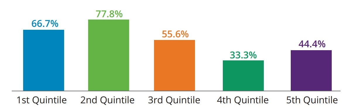 Akcie z druhého kvintilu dle výše dividendového výnosu dosahovaly v letech 1929-2018 nejvyšších výkonů ze všech dividendových akcií. Číslo vyjadřuje procentuální podíl těchto akcií z daného kvintilu, které překonaly v daném období výkonnost indexu S&P 500