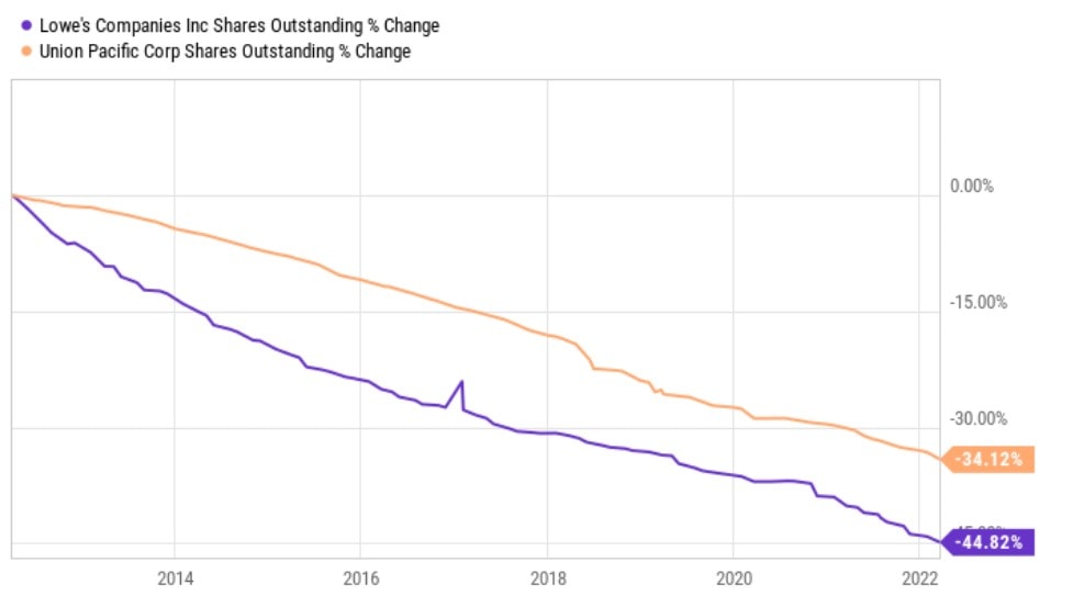 Pokud má navíc společnost stále k dispozici ještě volnou hotovost, může její vedení také zvážit snížení počtu volně obchodovaných akcií prostřednictvím programů zpětného odkupu akcií. Podívejme se například na klesající počet akcií u dvou zajímavých titulů s nízkým výplatním poměrem – Lowe’s a Union Pacific.
