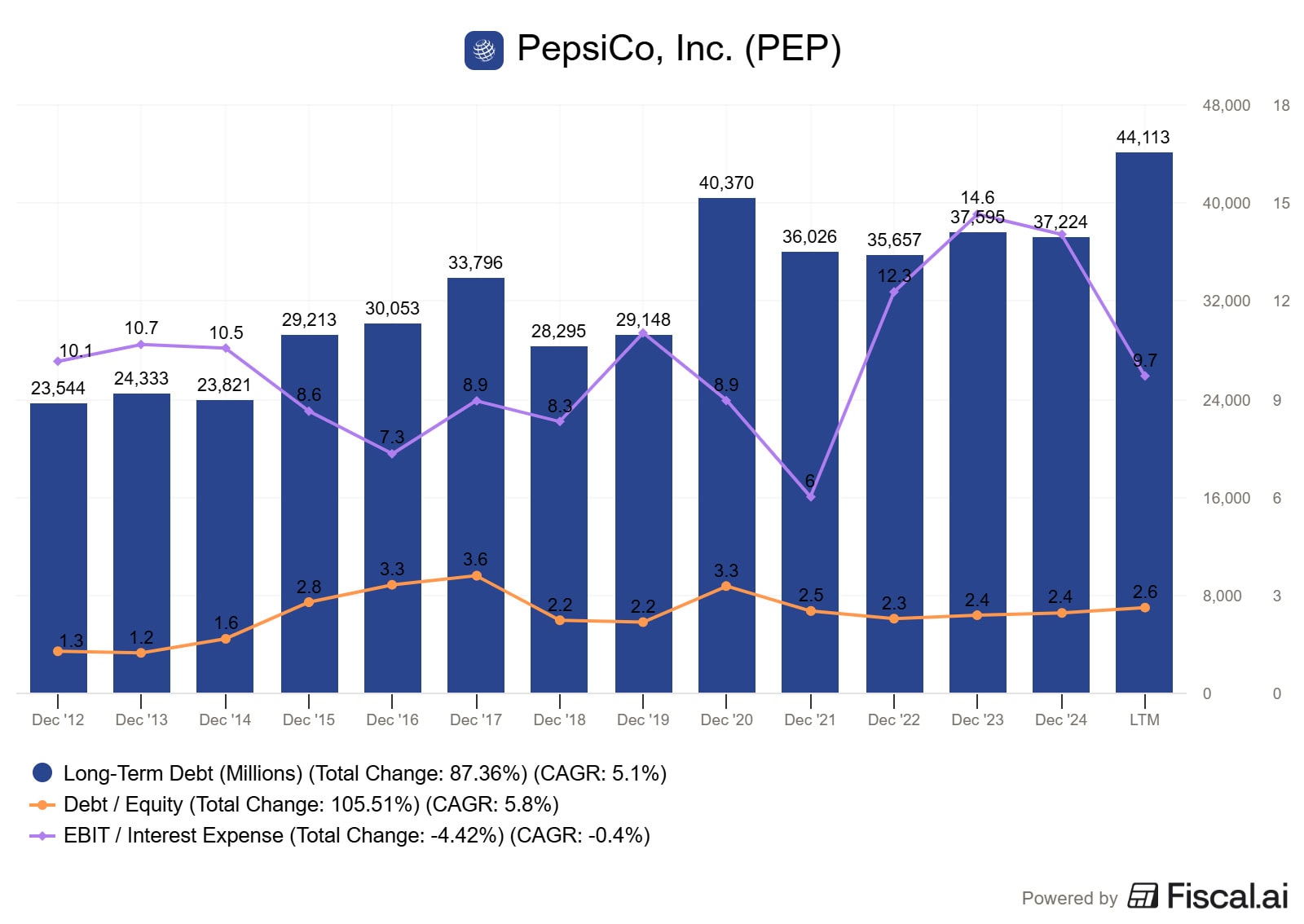 Zadlužení PepsiCo v poslední dekádě výrazně vzrostlo, nicméně schopnost obsluhy dluhu zůstává komfortní. Úrokové krytí se dlouhodobě pohybuje v pásmu 8–12× a také po růstu sazeb zůstává na úrovni, která nepředstavuje finanční stres.