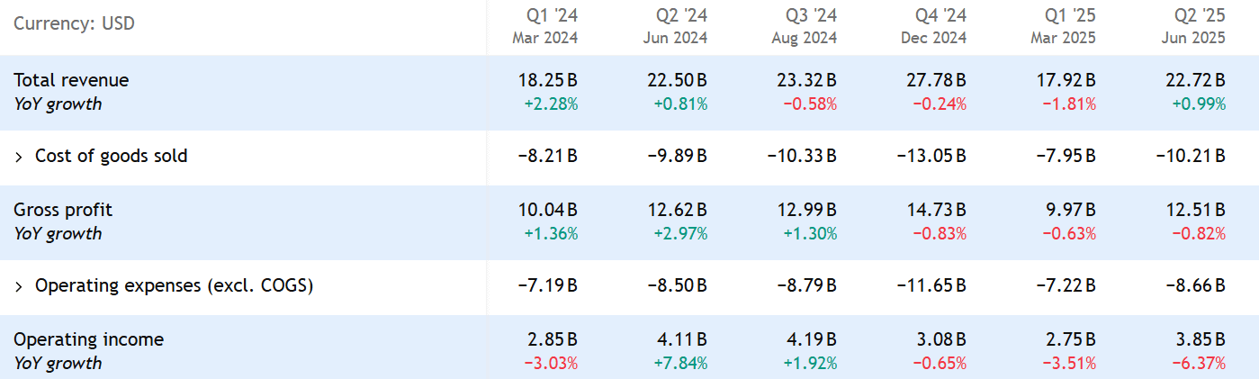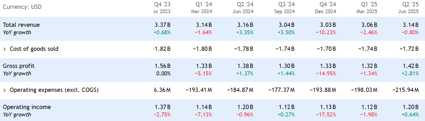 Tržby za rok 2024 stagnovaly na úrovni předchozího roku a zdá se, že ani letos k výrazné změně nedojde. V Q2 2025 tržby rostly jen o 0,8 %.