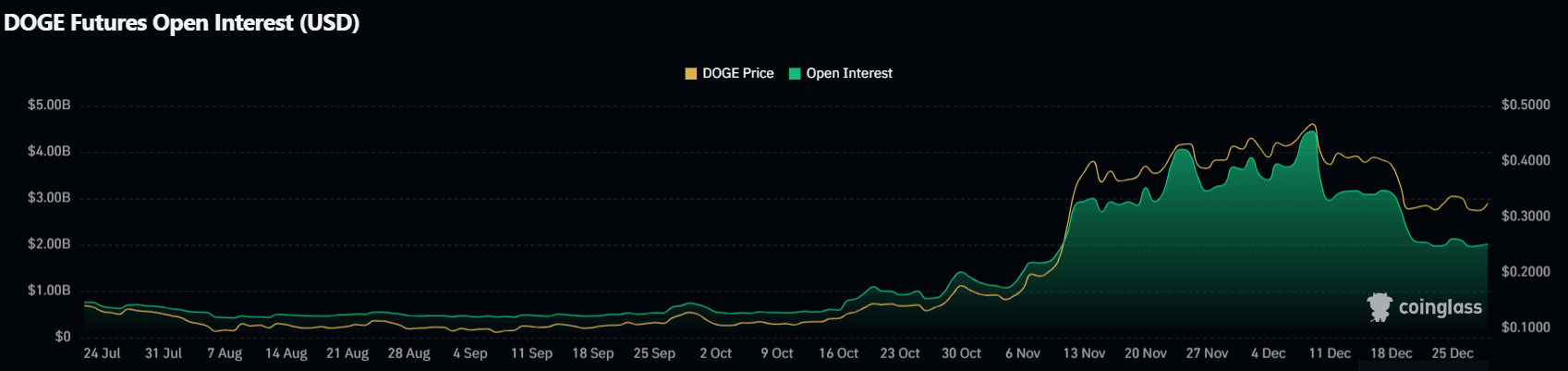 Futures open interest na Dogecoinu od července 2024