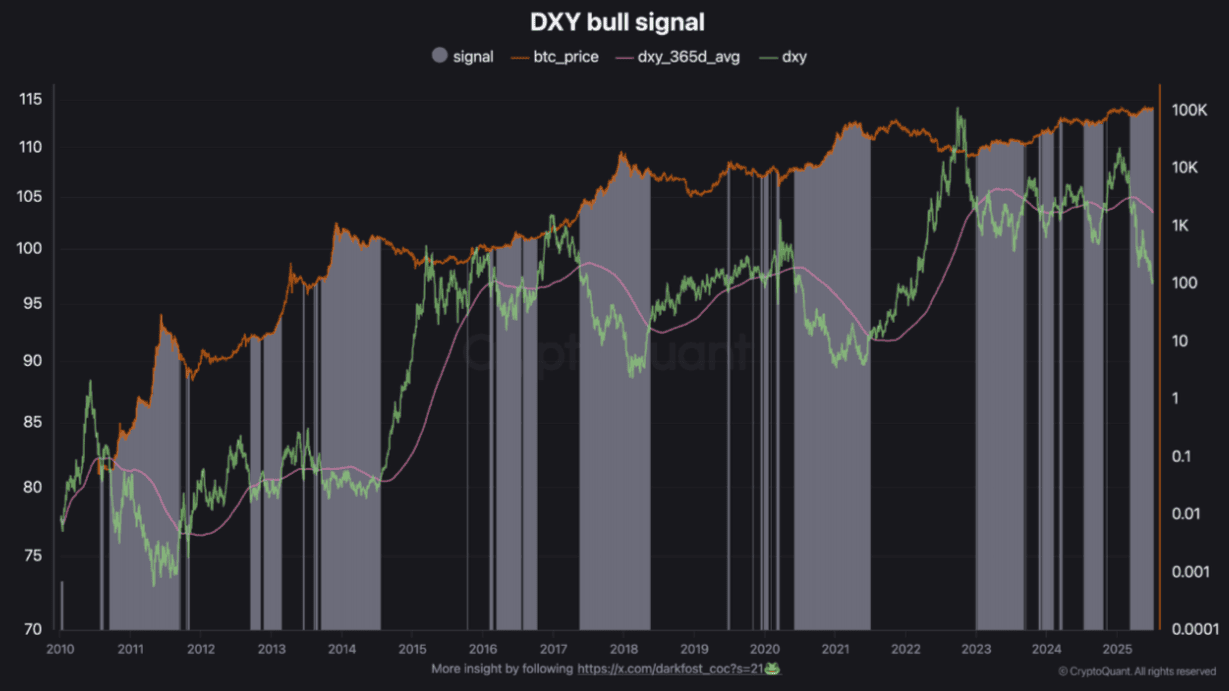 Největší kryptoměna dle tržní kapitalizace by z toho mohla profitovat, protože má inverzní korelaci s indexem DXY. To dokládá i nová analytická zpráva platformy CryptoQuant.